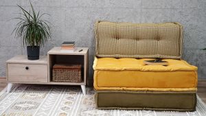 Modular folding couch beds are practical and very useful. Yellow green velvet fabric cushions set for homes, offices and even outdoors.