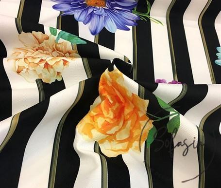 Black and white striped floral fabric digital printing drapery and sofa fabric. Width: 143 cm, washable, wipeable, stain-resistant, shrink-proof and colorfast. It is microfiber fabric. Since it is a woven fabric, it is air permeable. The paint used is certified. Product code: SZ-0623