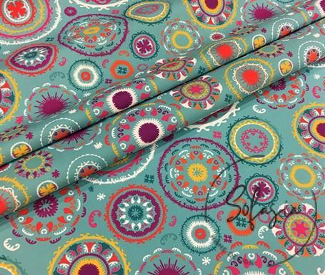 Turquoise floor patterned cushion fabric digital printing drapery and sofa fabric. Width: 143 cm, washable, wipeable, stain-resistant, shrink-proof and colorfast. It is microfiber fabric. Since it is a woven fabric, it is air permeable. The paint used is certified.